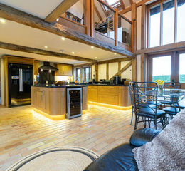 Visitors are welcomed into the property via the impressive entrance hall which features 2-storey vaulted ceilings along with full-height glazing on the front and rear walls, which floods the room with natural light. This then opens up into the beautiful open-plan kitchen/diner, which is adorned with brick flooring along with beamed ceilings and walls, situated in the heart of the home to create a fantastic place to entertain family and friends. From the dining area glazed doors with double height glazed panels above give access to the south facing gardens. The bespoke kitchen is fitted with a range of attractive storage units under granite worktops, which incorporate a Belfast sink, a free-standing range cooker with extractor hood over and an American-style fridge freezer, plus several integrated appliances. Neighbouring the kitchen is a useful utility room, which is again fitted with a range of storage units along with a single bowl ceramic sink and plumbing/space for a washing machine and tumble dryer. From the utility is access to a cloakroom WC and airing cupboard and through to the double garage with loft space above. Leading off the kitchen/diner on the opposite side of the property is the inviting living room, which again features attractive beamed ceilings and walls and enjoys a double aspect that looks out onto the surrounding gardens. The main focal point of the room, however, is the charming log burner, which adds a cosy feel to the space.