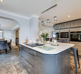 Doors from both living rooms open to the rear lobby, which leads directly to the contemporary open plan dining kitchen. Stone tiled flooring underfoot speaks of the rural-esque surroundings, whilst soft grey walls add a modern flair. A trio of pendant lights illuminate the dining space, with space for a corner sofa in the snug area. You can also dine casually at the breakfast bar.