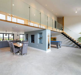 Interior — Design, Quality & Specification - Foxhole is a contemporary barn conversion with a clean, stylish interior. Industrial features sit alongside natural materials and exceptional natural light, creating a home that is both striking and practical. The ground floor centres on a large open-plan living, kitchen, dining and family room with a dedicated games area and mezzanine landing above. A utility room, plant room, boot room and integral garage complete the floor. The bespoke oak floating staircase with glass balustrade and mezzanine landing is the defining architectural feature of the interior. The home has been completed to a luxurious standard with boutique hotel style bathrooms, well- appointed kitchen with high specification integrated appliances and energy efficient features including airsource heating. The open plan living space is sociable yet homely with a central dual sided fireplace feature and two sets of sliding doors leading to the rear garden, bringing the outside in! Throughout the home, the abundance of glass fills the spaces with natural light and allows the rooms to enjoy panoramic views towards the Solway Coast. Five bedrooms and four contemporary en-suite bathrooms occupy the first floor, all finished to a high and consistent standard. A generous dressing room adjoining one bedroom offers flexible use as a dressing room, cinema room, gym, snug or home office. Every room enjoys elevated views across the Solway Coast.