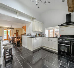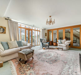 The principal reception spaces are beautifully arranged for modern family life and entertaining. The generous living room, centred around a Dovre wood burning stove, flows through a glass and oak retractable partition into a formal dining area. French doors from both rooms open onto the patio and gardens, allowing inside and outside living to merge seamlessly in the warmer months.