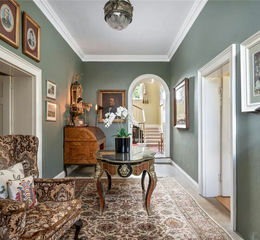 The principal rooms are arranged around a central entrance hall with flagstone flooring and a staircase rising through the house, establishing a clear and logical plan typical of its period. The drawing room is a refined, dual-aspect space with sash windows overlooking the gardens and countryside beyond, centred on a fireplace with marble surround. The adjoining dining room provides an elegant setting for formal entertaining, while a separate sitting room offers a more intimate reception space. All principal reception rooms enjoy strong visual connections with the surrounding grounds.