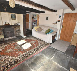with Inglenook open stone fireplace with multi-fuel stove inset, original slate flooring, radiator, beam ceiling, UPVC double glazed window to front.