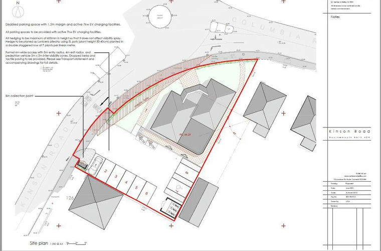 The land occupies a prominent corner position at the junction of Columbia Road and Kinson road. There are high volumes of vehicles along both roads. Within the immediate vicinity there are residential and commercial properties along both Columbia and Kinson road and neighbouring roads. The nearby residential districts are Ensbury Park, Kinson and Wallisdown