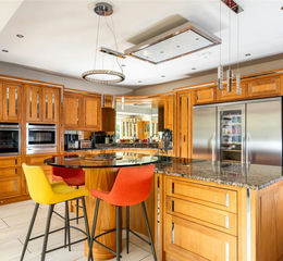 The real hub of the house is the open plan kitchen/conservatory which measures over 33 ft. by over 22 ft. and has two skylight windows in the kitchen area and a vaulted glazed conservatory with two sets of French doors to the rear garden. Glazed doors from the kitchen connect to the snug and the drawing room giving an excellent flow through the internal and external space for modern family life and entertaining. The kitchen/conservatory has porcelain tiled flooring with wet underfloor heating throughout, and two air conditioning/heating units. The conservatory is a versatile space which currently houses soft seating and a dining table and chairs. The kitchen was designed and fitted by Heaven and Stubbs about 13 years ago and has a comprehensive range of American Walnut full height, base, and wall units including a larder cupboard, a pull out larder unit, pan drawers, a glazed display cabinet, and bespoke matching trays and chopping boards.