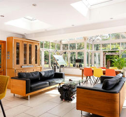 The studio can also be accessed via a door from the side hall. This versatile room was originally an indoor swimming pool and this could be reinstated if desired. It has plenty of natural light with triple aspect windows, Velux skylights, and glazed bi-fold doors across the full width of the room at the rear connecting it to a paved terrace in the garden for al fresco entertaining. The studio is currently used to display a collection of motorbikes but could alternatively be used as a garden, hobby or play room.