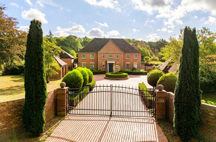 The house is set well back from the road and is screened from view by walls, beech hedges and mature trees. The property has two separate drives both with wrought iron gates. One drive is gravelled and leads down the side of the house to a parking area with access to the rear garden. The main block paved drive has electric double gates which are controlled via an app, and leads to an extensive parking area with a turning circle and access to the house and the two sets of garages. The front garden has lawned areas with inset trees, bordered by clipped box hedges and shaped trees. There are box hedge rose beds either side of the front door and the central turning circle on the drive has a box hedge surrounding a contemporary sculpture which mirrors the shape of the clipped trees along the drive.