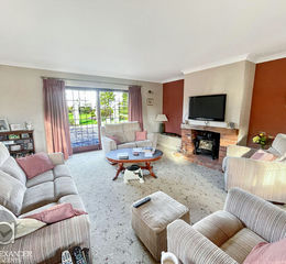STEP INSIDE You are welcomed into the property via a generous reception hall measuring 21' x 13' (6.40m x 3.96m), which immediately sets the tone for the spacious accommodation throughout. From here, the layout flows naturally into the principal living areas. To the right, the large sitting room (18'10" x 18'6" / 5.74m x 5.64m) enjoys a dual aspect feel and features an open fireplace with a log burner inset, creating a warm and inviting focal point.