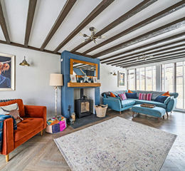 The property is well maintained and enjoys excellent natural light throughout. A key feature is the open-plan kitchen/dining/sitting room. The kitchen is fitted with a range of wall and base units together with a corner larder cupboard and includes integrated appliances: a double electric oven, induction hob with extractor over, fridge/freezer, dishwasher and a wine cooler. The sitting area features exposed beams, a central fireplace with wood burner, large front aspect windows, rear windows and a bi-fold door opening onto the garden. Stairs lead to the first floor, where there are three double bedrooms and a modern family bathroom.