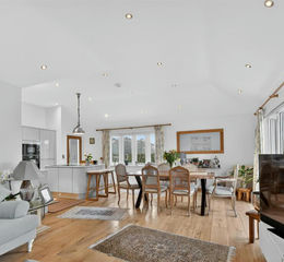 The DINING AREA connects seamlessly with the garden, extending out to a porcelain laid terrace to form an effortless space for indoor/outdoor entertaining. Electric blinds to the roof lights and bi folds provide enhanced comfort and simple, intuitive control. Adjacent, the SITTING ROOM completes this striking L shaped layout to admire the far stretched views.