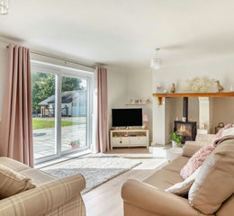 Down the hallway you will find the living room which has been perfectly designed for comfort and relaxation. Featuring a large sliding door that opens directly to the garden and floods the room with natural light. The views of the landscaped outdoor space make this an inviting retreat for the whole family. Additionally, you will find a log burner set within a characterful fireplace providing a charming focal point, crafting a cosy ambience during the cooler months.