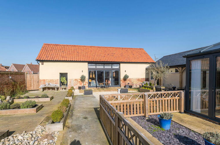 Outside, the principal garden is to the front (south) which is both enclosed and private, comprising terraces areas that are partially defined by brick and flint boundary walls.