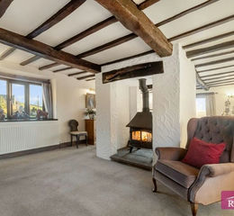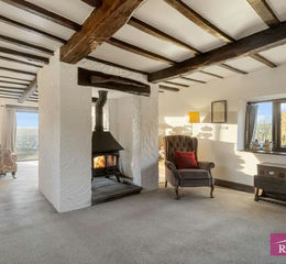 With double sided cast iron multi fuel stove, large picture window with stunning open views, three radiators and beamed ceiling.
