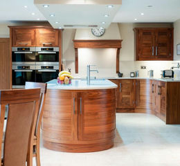 - Contemporary walnut and quartz dining kitchen with extensive Miele appliances and island