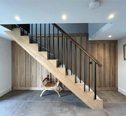 Attractive staircase to first floor with attractive American black walnut panelling to walls and ceramic tiled flooring. Under the stairs is a 'hidden' panelled door to a bespoke fitted bar with illuminated display shelving. A second hidden door leads to: