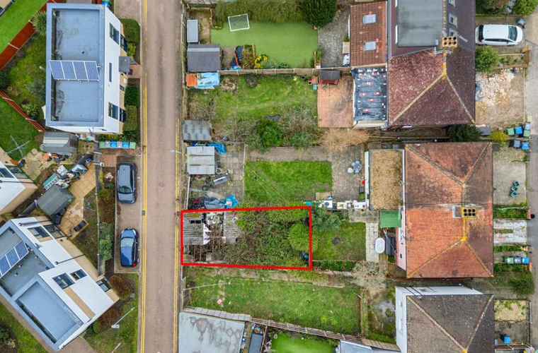 Freehold plot of land for sale via the Modern Method of Auction. The site measures approximately 40 feet in length, with a width of around 20 feet narrowing to 18 feet. Access to the land is off Waters Square.