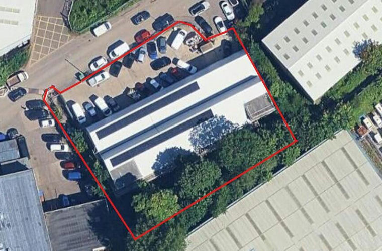A detached steel framed warehouse/office unit of brick construction with a new metal sheet profile clad roof incorporating PV panels and a large secure yard.