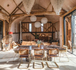 Externally, traditional black weatherboarding preserves the barn’s identity, while a newly constructed roof replicates the original profile and pitch. As many original clay roof tiles as possible were salvaged and now clad one of the gable-ended entrance porches, maintaining material continuity. Industrial surface-mounted lighting reinforces the building’s rural vernacular. Internally, the original 300-year-old timber frame has been painstakingly restored and remains fully expressed within the dramatic double-height entrance hall and principal living space. A restrained palette of earthy, mineral tones complements the aged timber structure and softens the vertical scale of the vaulted ceilings. Generous proportions define the central living volume, where expansive glazing maximises natural light and connects directly to the garden. Custom-made steel doors introduce a subtle contemporary counterpoint to the historic fabric.