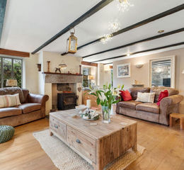 Oak flooring, triple aspect room, radiator, woodburning stove (note: this stove has been decommissioned as it used to heat the hot water and will need to be replaced with a new woodburner only), exposed timber beams, exposed natural stonework, French doors onto