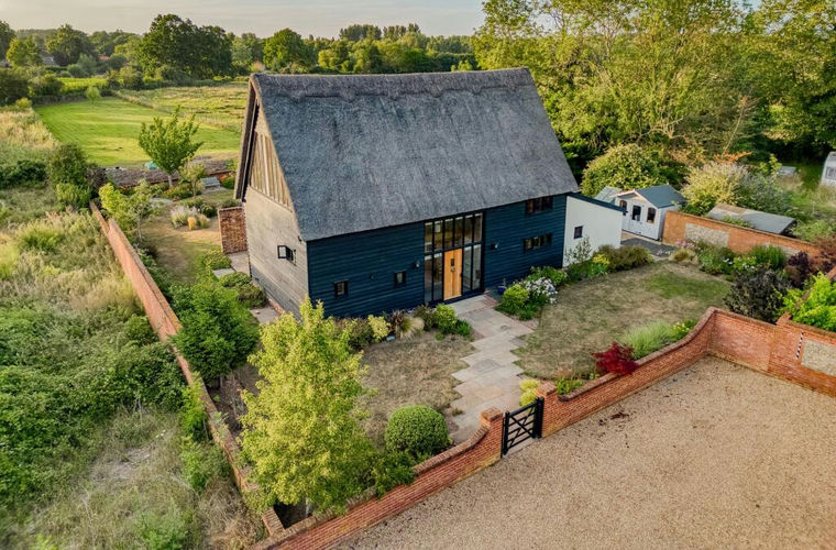 The property is enveloped by beautifully landscaped, wrap-around gardens, introduced by a charming winding pathway that leads you to the front entrance. The barn’s captivating exterior blends heritage and contemporary design, featuring an original thatched roof, striking black cladding, and classic brickwork—preserving the soul of the structure while presenting a bold modern silhouette.