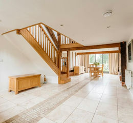 - Striking architectural character throughout featuring exposed timber beams, vaulted ceilings, rustic brickwork, and floor-to-ceiling glazing that brings in natural light