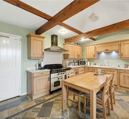 Entrance hall, sitting room, family room, breakfast kitchen, four bedrooms, bathroom and a shower room. Extensive parking and a double garage. Garden, timber stable block with feed store, brick stable and a store. Fenced menage and an adjoining paddock. Total area of approximately 1.7 acres.