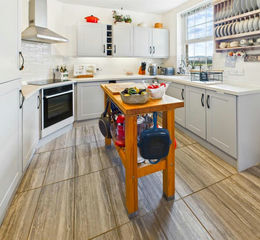 Kitchen/Dining Room - Newly fitted with base cupboards with work surfaces over, butler style sink with mixer tap, space for oven, wood effect flooring, inset ceiling lights, radiator, doorway to the bedroom/sitting room and door to: