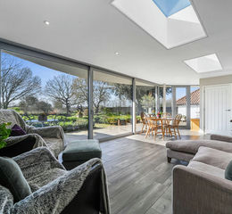 - Contemporary garden room addition (2017) with zinc roofline, skylights and full-height glazed doors