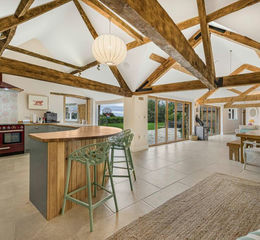 A gate leads to the inner gardens and the Barn. Formerly two separate cow sheds, they have been joined by an impressive link and now include a large triple glazed viewing window and 6 metres of new bi-fold patio doors to bring the outside in and benefit from the large patio area, perfect for entertaining, and the exceptional panoramic views towards the North Wessex Downs.