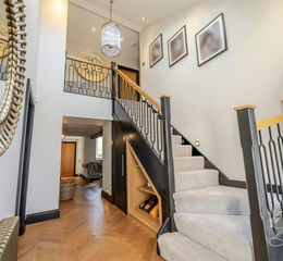 Landing - A stunning landing and staircase overlooking the hall, enhanced by a high vaulted ceiling and a velux window that fills the space with natural light. Plush carpets run seamlessly along the stairs and landing, creating a soft and elegant pathway that leads to each bedroom