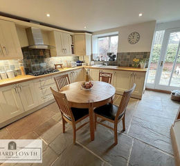 Beautiful 4 bedroom / 2 bathroom barn conversion situated within a small and highly regarded enclave of characterful properties, this attractive property offers a wonderful combination of period charm, generous space and village convenience. Enjoying a peaceful setting with a distinctly rural feel, yet within easy reach of the village centre and local amenities. As you approach this home's central position within this courtyard-style development, its enclosed paved front garden and feature oak porch, beautifully frames the entrance area and leads into an inviting reception hallway. Inside, the hallway is finished with attractive stone tiled flooring, which flows seamlessly throughout the ground floor areas, creating a cohesive and practical living space. From the hallway, there is access to a useful cloakroom/wc, fitted with white suite and wash basin, as well as a well-equipped utility room featuring cream cabinets and generous storage. Opening into the breakfast kitchen, there is a bright and sociable space with room for a breakfast table. The kitchen is well appointed with gas hob, feature Belfast sink and ample worktop space. A door from the kitchen provides direct access out to the garden. The impressive lounge and dining room, measuring approx 21' 9" x 13' 6" offers beautifully proportioned reception space. Currently arranged with a comfortable lounge area to the front, the room features a charming log burner and defined dining area, providing the ideal setting for entertaining or family meals.
