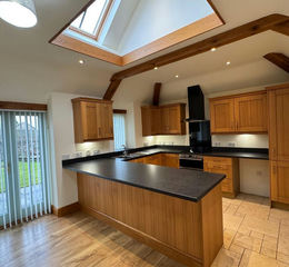 Windows to rear and Velux to front and rear, range of wall and base units with laminate worktops over, single drainer one and a half bowl sink unit, breakfast bar, inset electric hob with cooker hood over, fitted oven and grill, space for fridge, plumbing for washing machine & dishwasher, kitchen area is tiled floor and living area is Karndean flooring with under floor heating in both sections. Bi-folding doors to front, French doors to rear garden, exposed beams.