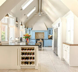 A magnificent kitchen with granite U-shaped preparation work surfaces, two enamel sink units with swan mixer taps and a comprehensive series of white finished base cupboards, drawers with further powder blue coloured units and Rangemaster cooker with five burner gas hob with ovens and grill under and extractor hood over. There is an end breakfast bar, housing for an American styled fridge/freezer with pantry storage cupboards either side, the continuation of the flagstone tiled flooring. Having Velux roof windows and windows to the rear with louvered shutters there is access to further kitchen area with vaulted ceiling, roof window, spotlighting, two radiators, flagstone tiled flooring and feature arch windows to the rear with matching archway giving access to the superb garden room.