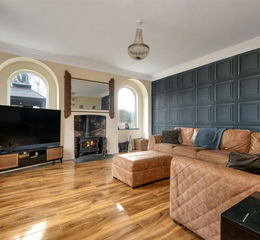 Having a fireplace with inset wood burning stove on slated hearth, radiator, ornamental coved ceilings, feature arched double glazed windows to the side and picture windows to front.
