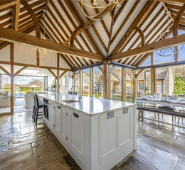 To the rear lies the heart of the home; a magnificent open plan kitchen and dining room for sociable living. Floor-to-ceiling glazing frames the gardens, while a vaulted ceiling with exposed beams introduces character and architectural interest. The kitchen is thoughtully appointed