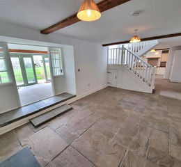 From the entrance porch you step down into the large open plan kitchen/dining/sitting room. The kitchen area has a range of eye and base level units with a range cooker and space for white goods. A door opens into the rear porch and ground floor WC. Beyond the kitchen is space for a family dining table. The sitting area centres around a chimney breast housing a multi fuel wood burner. The whole ground floor benefits from underfloor heating. French doors take you through to the separate garden room which is dual aspect with a vaulted ceiling and features bi fold doors enjoying a great view over the lawns. Off the staircase there is a half landing with a picture window overlooking the gardens. On the first floor are 3 bedrooms (2 en suite) plus a separate family bathroom. The first floor has exposed wooden A frames and a feature Victorian fireplace (not in use). The master bedroom has built in wardrobes and a great view towards fields.