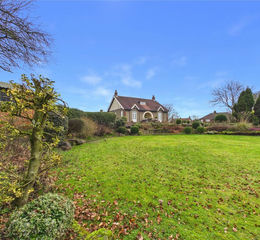 The approach is impressive. A sweeping driveway curves through established grounds, creating an immediate sense of arrival while providing extensive parking and access to the detached garage and additional outbuildings. The house itself sits proudly within the plot, framed by structured planting, mature hedging and shaped topiary, with tiered sections of lawn and stone retaining walls adding depth and architectural interest.