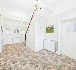 Internally, the accommodation offers substantial proportions, with flexibility to adapt and enhance subject to individual requirements. The principal lounge is an elegant and generously scaled reception room, reflective of the home’s original character. High ceilings, deep skirting boards and decorative picture rails reinforce its period integrity, while the expansive footprint allows for multiple seating arrangements without compromising flow. A striking bay window projects outwards, framing elevated views across the front garden and beyond, flooding the space with natural light and creating an inviting seating nook. A tiled fireplace provides a central focal point, anchoring the room and offering clear scope for enhancement should a purchaser wish to introduce a more contemporary statement feature. The scale and symmetry of this room make it equally suited to formal entertaining or relaxed family living.