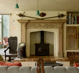 On the other side of the entrance hall is an atmospheric sitting room with a large stone fireplace. Beyond lies a spectacular studio with soaring ceilings and exposed trusses; south-facing windows wash the room in a day-long light. There is an additional study beyond, as well as a workshop, a cinema room, a WC, and a store, which provides access to the outdoors.