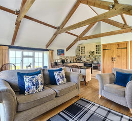 Both homes are arranged to take full advantage of the breathtaking outlook across open countryside towards the sea. Interiors are bright, welcoming and thoughtfully designed, blending rustic charm with modern practicality. The principal living areas are arranged in open-plan kitchen and sitting rooms, creating sociable and versatile spaces ideal for both everyday living and entertaining. Large windows frame expansive rural and coastal views, flooding the interiors with natural light. A defining feature of Raddons is its impressive vaulted ceiling, which enhances the sense of space and creates a striking architectural focal point. Exposed timbers add warmth and character while reinforcing the heritage of the original barn conversion.