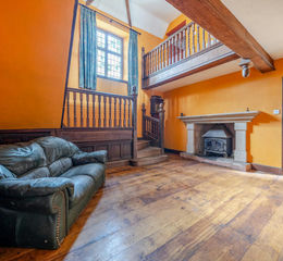 The accommodation is impressively spacious and versatile; a welcoming porch opens into a striking reception hall, where a graceful turning staircase forms an immediate focal point and sets the tone for the rest of the house. The hall is very useable as a reception room, with a Bath stone fireplace and inset ‘Woodwarm’ wood burning stove. From here, doors lead to a separate reception room, ideal for cosy evenings, and to the other side of the hall, an expansive dual aspect living room with exposed beams, a feature fireplace with a large ‘Woodwarm’ wood burning stove, timber flooring, and an impressive sense of volume.