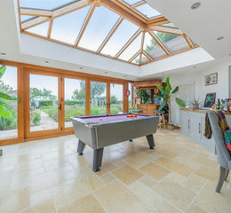 Accommodation - Entrance via newly fitted oak door with oak framed glazed either side windows into the hallway which has an attractive quarry tiled floor and panelled doors providing access to the inner hallway bedroom one, four and the family room. The family room has a vaulted ceiling with exposed A-frames a reclaimed brick fireplace with cast iron wood burner. French doors open to the garden room and panelled doors to the kitchen/breakfast and sitting room.