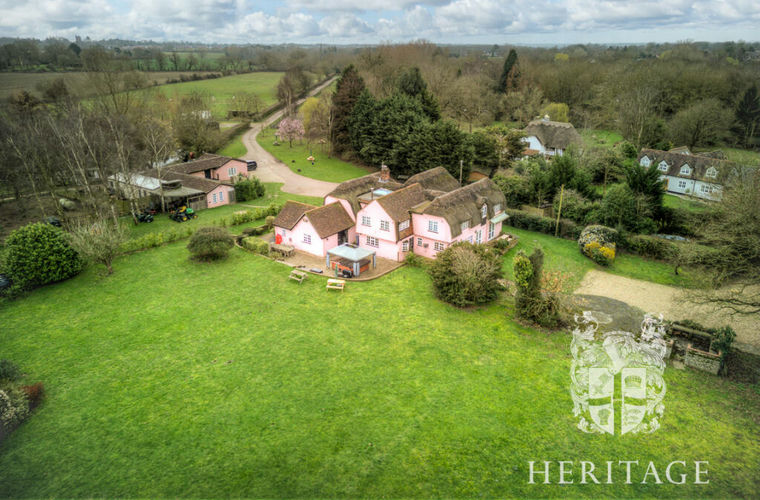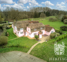 A rare unlisted thatched home in Great Horkesley, Essex. Set in approximately 2.6 acres (subject to survey) of peaceful grounds, it features a country kitchen with Aga, period fireplace, and a 1-bed holiday let. Over 4,100 sq. ft of characterful living surrounded by fields. No onward Chain