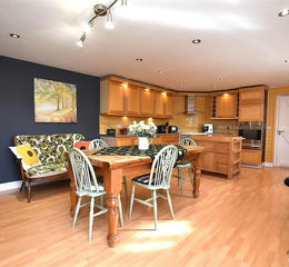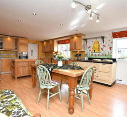 Kitchen/Dining Room - 6.7m x 4.4m (21'11" x 14'5") - An impressive sociable entertaining space with the kitchen area appointed with an extensive range of shaker style base and wall cupboards complimented by work surface areas incorporating a Franke 1 1/2 bowl stainless steel single drainer sink unit with mixer tap, Miele oven/grill with warming drawer below, Neff integrated microwave/combination oven, Neff four ring hob with Neff stainless steel extractor hood above, Neff integrated deep fat fryer with extractor fan above, integrated dishwasher, integrated fridge, integrated weighing scales, wine racks, Aga gas fuelled Range cooker incorporating four ovens, two hot plates and warming plate, part tiled walls, inset ceiling spotlights, plinth heater, two double glazed windows, wood effect flooring and cottage style door which leads to: