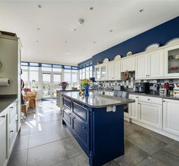 The original side of the home retains an abundance of character, with exposed stone walls and architectural features that celebrate the building’s heritage. The principal reception room is a particularly impressive space, defined by its high ceilings and a striking feature fireplace complete with a log burner, creating a warm and atmospheric setting in which to relax and unwind. Complementing the main reception room is a separate dining room, perfectly suited to entertaining, along with a dedicated office area that provides a quiet and practical workspace within the home. At the heart of the extended section of the property lies the spacious kitchen and breakfast room, designed as a bright and sociable space where everyday life naturally unfolds. Large windows invite natural light throughout the day while offering delightful views across the surrounding gardens and countryside.