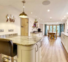 A bright and spacious family kitchen dining space, range of fitted cabinets and breakfast bar with granite work surface, integrated twin ovens, induction hob and dishwasher. A walk in pantry provides additional storage and space for the fridge freezer. Open plan to the dining area and a play room.