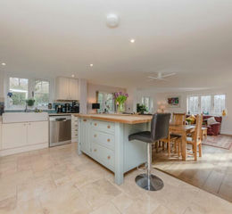 KITCHEN/DINING ROOM- A simply stunning room, flooded with natural light from the expanse of glass and roof window. This beautiful room is the heart of day-today living with areas for cooking, relaxing and both formal and informal dining. With stylish shaker style wall and base units with complimenting wooden worktops, featuring an island with the similar stylish design providing further storage. 4 ring ceramic hob with cooker hood above and tiled splashback surround, eye level oven and warmer drawer and dishwasher. Large ceramic Butler sink with mixer tap and side aspect window above overlooking the garden. Space for large fridge freezer. Step down to living/dining area. With wooden floors, built in storage on one side and rear and side aspect windows allowing lots of natural light. Double doors open directly to the garden and patio allowing a natural flow