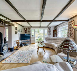 The substantial living room is light and airy, enjoying a dual aspect and centred around an impressive feature fireplace with woodburning stove set on brick parquet-style flooring, and decorative beams.