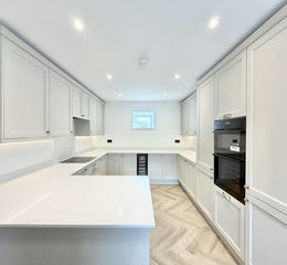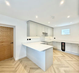 A beautifully appointed fitted kitchen featuring an extensive range of grey shaker-style wall and base units with feature under-cabinet lighting. Quartz worktops with matching upstands incorporate a sink with mixer tap. Integrated appliances include a double oven, full-height fridge, full-height freezer, dishwasher and wine cooler. Electric hob with extractor above and quartz splashback. Two double glazed windows allow excellent natural light. Finished with herringbone LVT flooring and underfloor heating.