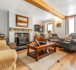 4.62m x 5.18m (15-2-x 17-0') A light and spacious living room with a beautiful central fireplace boasting a red brick inset and housing a substantial multi fuel stove, perfect for warm and cosy nights in. Wooden beam detailing and a beautiful oak flooring add a sense of character and history and there is an under the stairs cupboard for ensuring the home is kept clutter free. The open wooden staircase leads invitingly up to the first floor.
