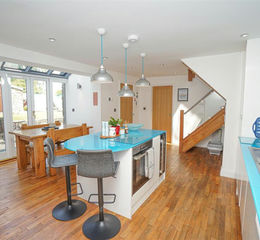 Kitchen/Diner - 5.94 x 5.18 (19'5" x 16'11") - Flooded with a wealth of natural light, the kitchen is extremely well-fitted with a range of glass worktops comprising a stainless steel 1 and 1/2 bowl sink and drainer unit with drawers and cupboards below, built-in oven and hob with extractor over. Additional built-in appliances including fridge/freezer, washing machine and wine cooler, central island with glass worktops and cupboards below, perfectly finished with LED lighting. Benefitting from stylish timber flooring and ample dining space opening to the garden.